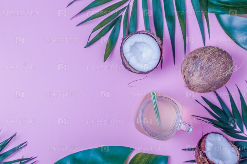 Кокосовая вода и кокосы на ярком пастельном фоне