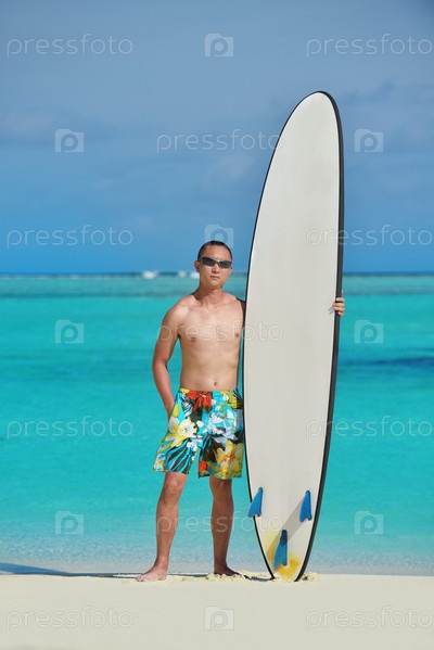 Мужчина с доской для серфинга на пляже