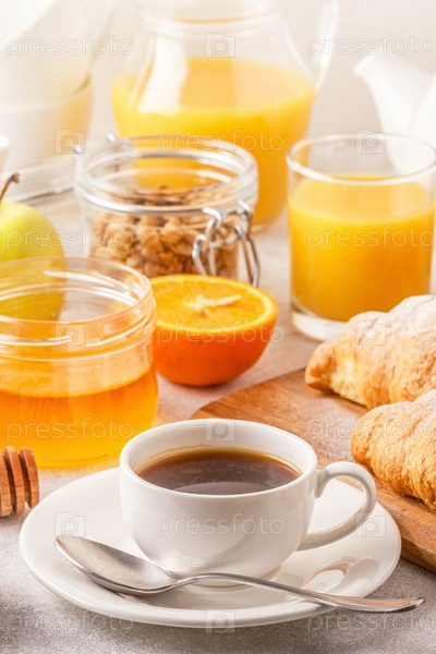 Континентальный завтрак со свежими круассанами, апельсиновым соком и кофе