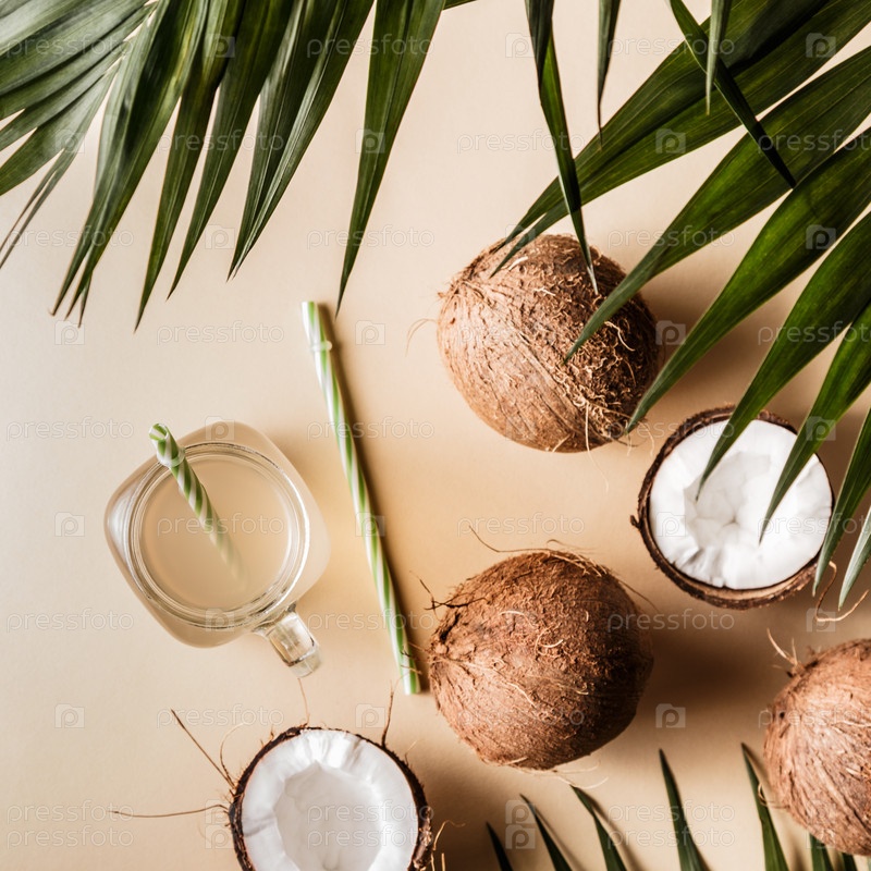 Кокосовая вода и кокосы на ярком пастельном фоне