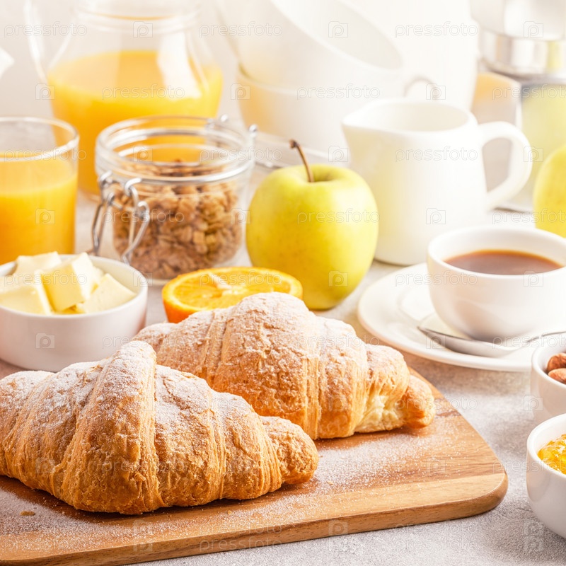 Континентальный завтрак со свежими круассанами, апельсиновым соком и кофе