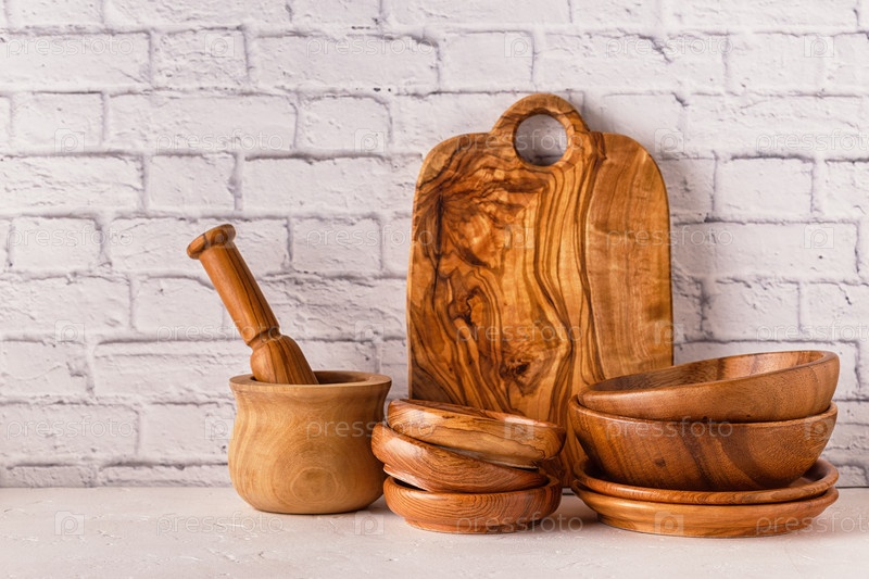 Деревянная посуда на белом столе