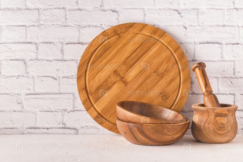 Деревянная посуда на белом столе