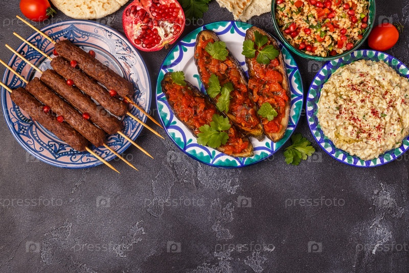 Классический шашлык, салат табуле, баба гануш и запеченные баклажаны с соусом