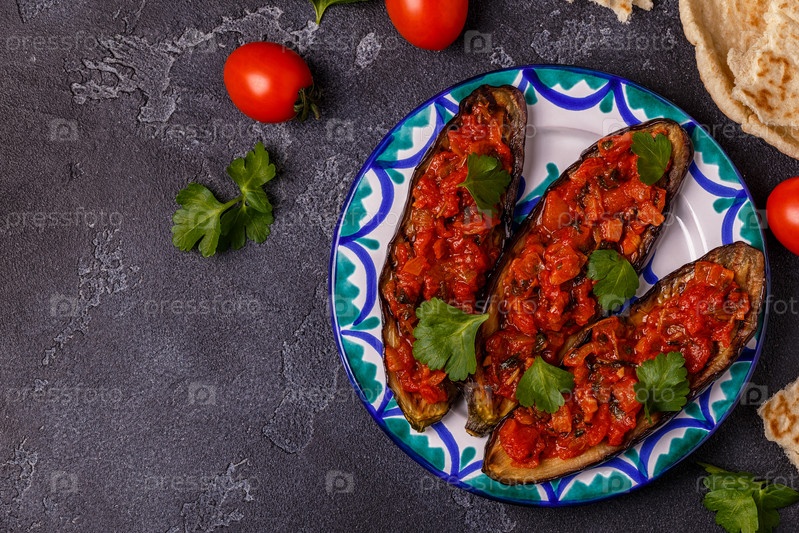 Запеченные баклажаны с помидорами, луком, чесноком и петрушкой