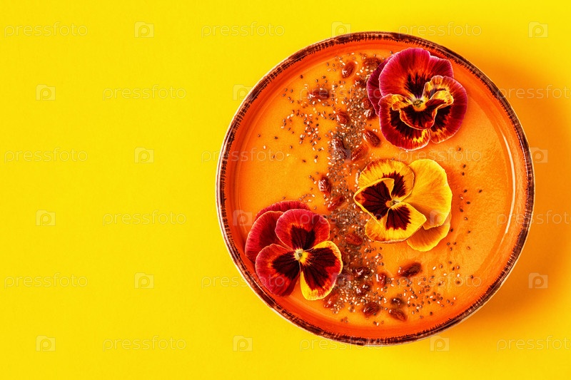 Чаша для смузи со съедобными цветами анютиных глазок, семенами чиа, ягодами годжи