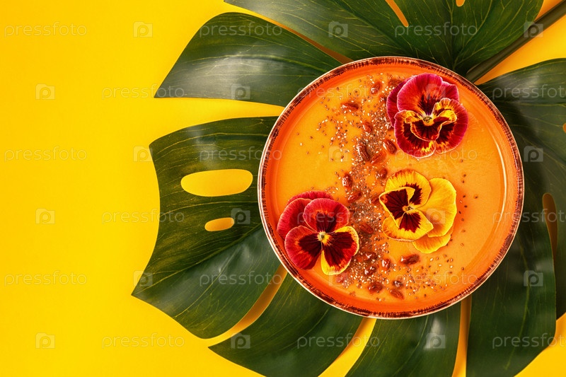 Чаша для смузи со съедобными цветами анютиных глазок, семенами чиа, ягодами годжи