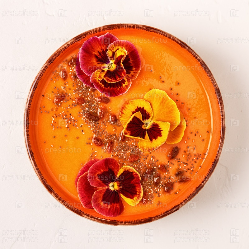 Чаша для смузи со съедобными цветами анютиных глазок, семенами чиа, ягодами годжи