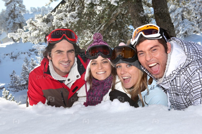 Четверо друзей, лежащих в снегу