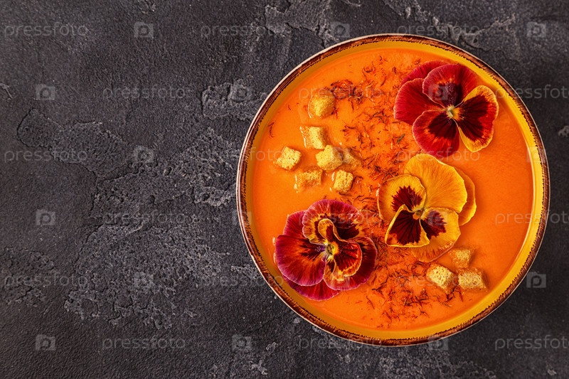 Тыквенно-морковный суп с шафраном и съедобными цветками анютиных глазок