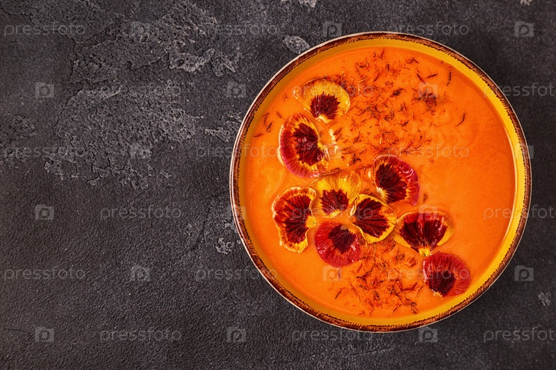 Смузи или суп из тыквы/моркови с шафраном и съедобными лепестками цветов анютиных глазок