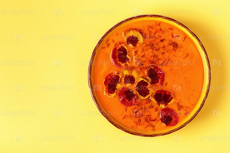 Смузи или суп из тыквы/моркови с шафраном и съедобными лепестками цветов анютиных глазок