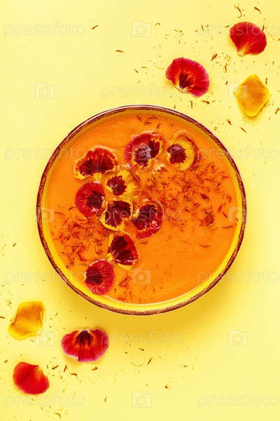 Смузи или суп из тыквы/моркови с шафраном и съедобными лепестками цветов анютиных глазок