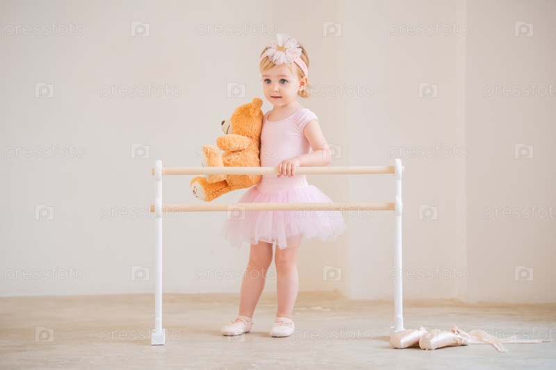 Симпатичная голубоглазая балерина в розовом, стоящая возле балетного станка с плюшевым мишкой в руках. Концепция мечты стать балериной