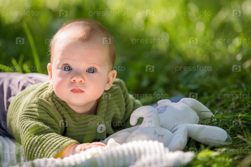 Пятимесячный ребенок лежит в траве на белом пледе с игрушкой. Смотрит в кадр