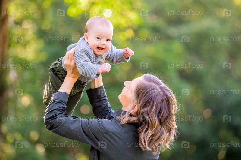 Портрет счастливой молодой матери с полугодовалым ребенком на руках летом на природе в парке