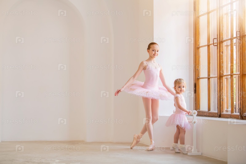 Старшая сестра, балерина в розовой пачке и пуантах, показывает малышке, как заниматься