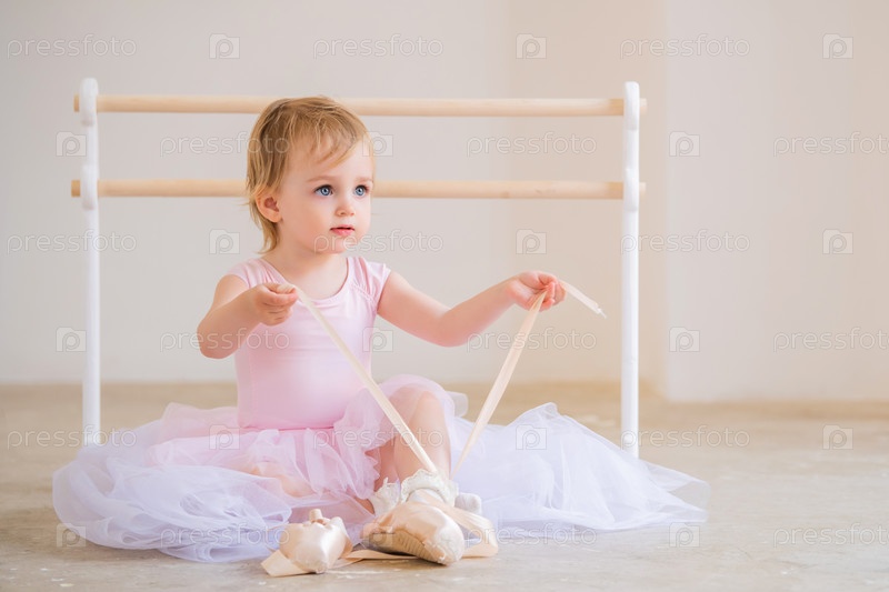 Портрет милой голубоглазой балерины в розовом, сидящей возле балетного станка и надевающей пуанты