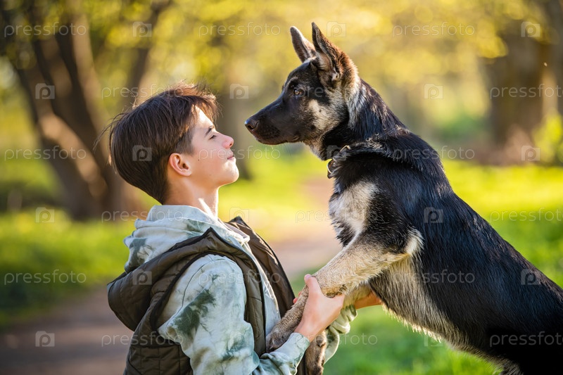 Мальчик с собакой гуляет в парке солнечным весенним вечером, сидит на траве, собака целует хозяина. Дружба человека и животного, здоровый образ жизни