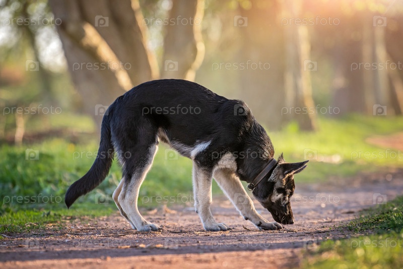 Щенок восточноевропейской овчарки нюхает, смотрит, охотится на дороге в летнем лесу