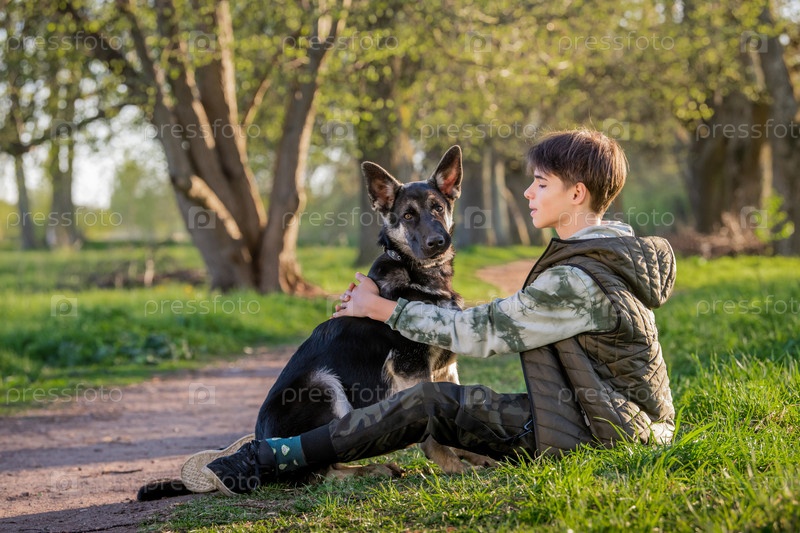 Мальчик с собакой гуляют в парке солнечным весенним вечером, сидят на траве. Дружба человека и животного, здоровый образ жизни