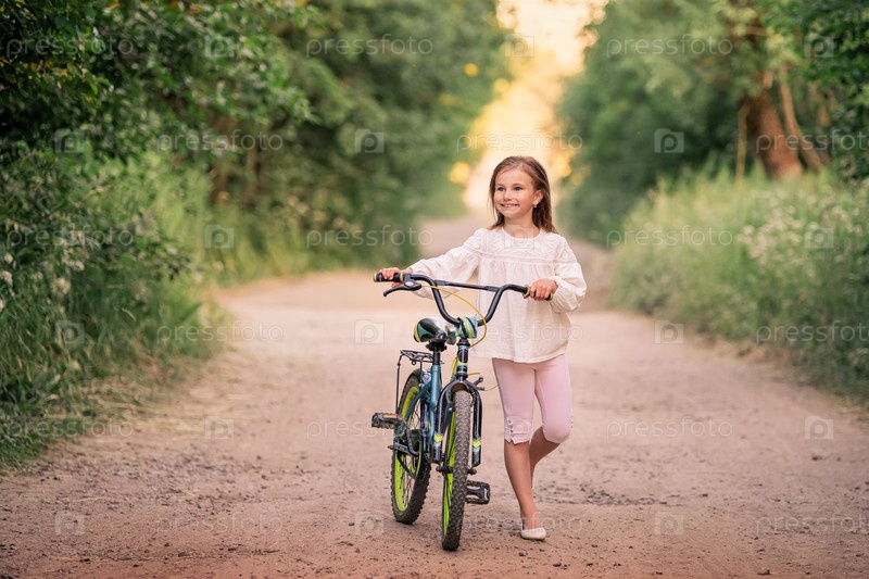 Маленькая девочка едет на велосипеде по сельской дороге на природе на закате