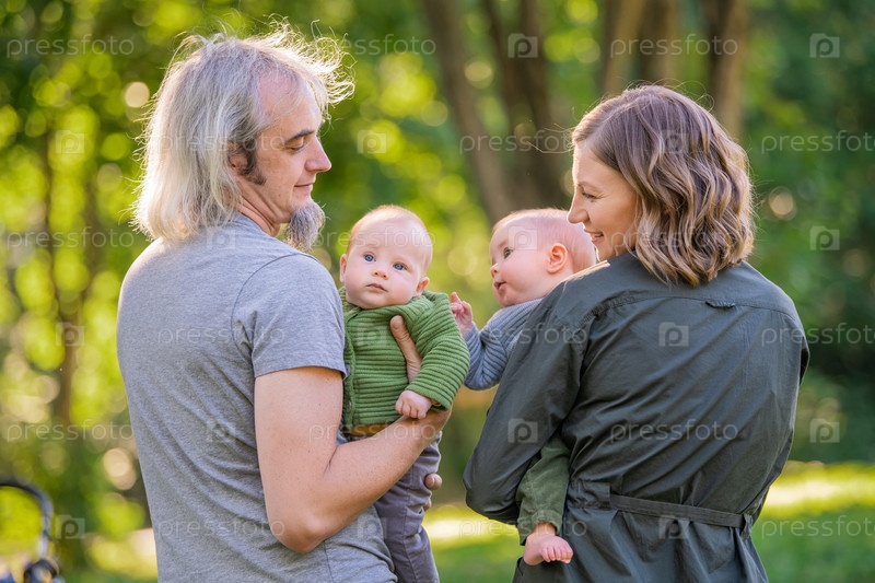 Счастливая супружеская пара с двумя маленькими близнецами, отдыхающими на природе. Портрет на фоне зелени