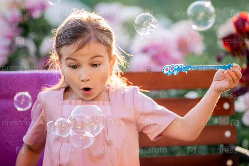Девушка пускает мыльные пузыри на фоне цветов в саду. На лице эмоции удивления и восхищения