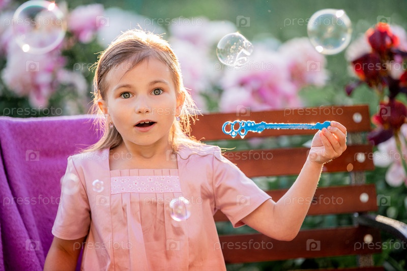 Девушка пускает мыльные пузыри на фоне цветов в саду. На лице эмоции удивления и восхищения