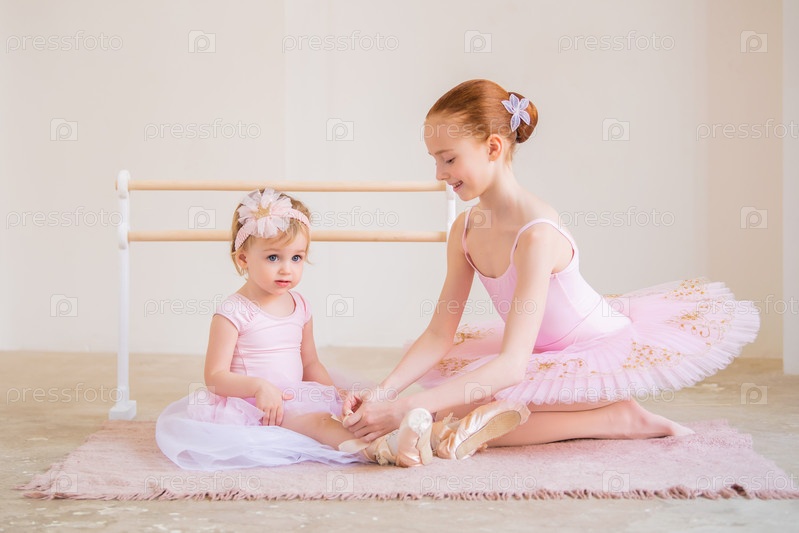 Старшая сестра, балерина в розовой пачке, надевает малышке пуанты, сидя у станка