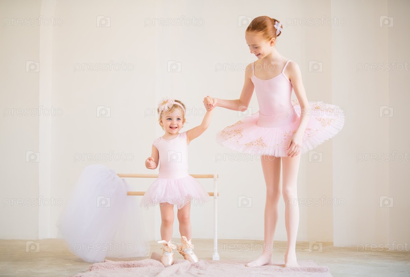 Старшая сестра, балерина в розовой пачке и пуантах, показывает малышке, как заниматься у станка