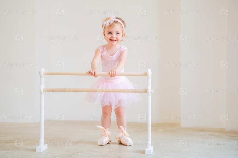 Портрет милой голубоглазой балерины в розовом трико и больших пуантах, стоящих возле балетного станка