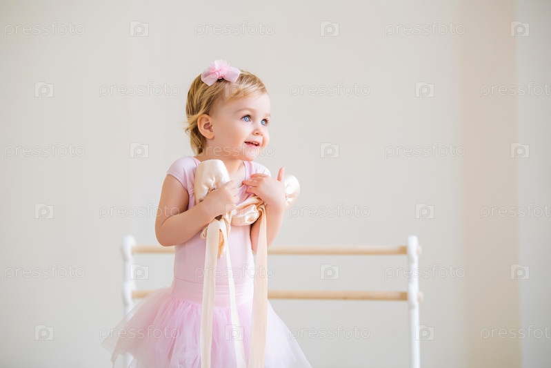 Портрет милой голубоглазой балерины в розовых обнимающих пуантах