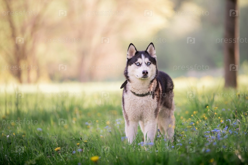 Очаровательная собака породы сибирский хаски черно-белого окраса гуляет в ошейнике на природе в парке