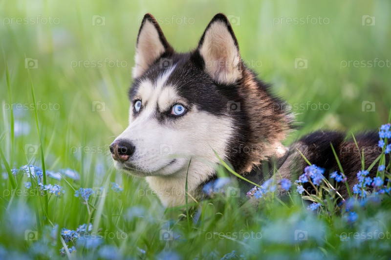 Смешная собака. Портрет голубоглазого сибирского хаски хитро смотрит в сторону среди незабудок