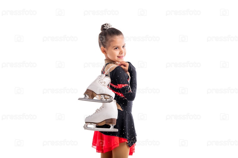Портрет маленькой фигуристки с коньками в руках, показывающей жест успеха