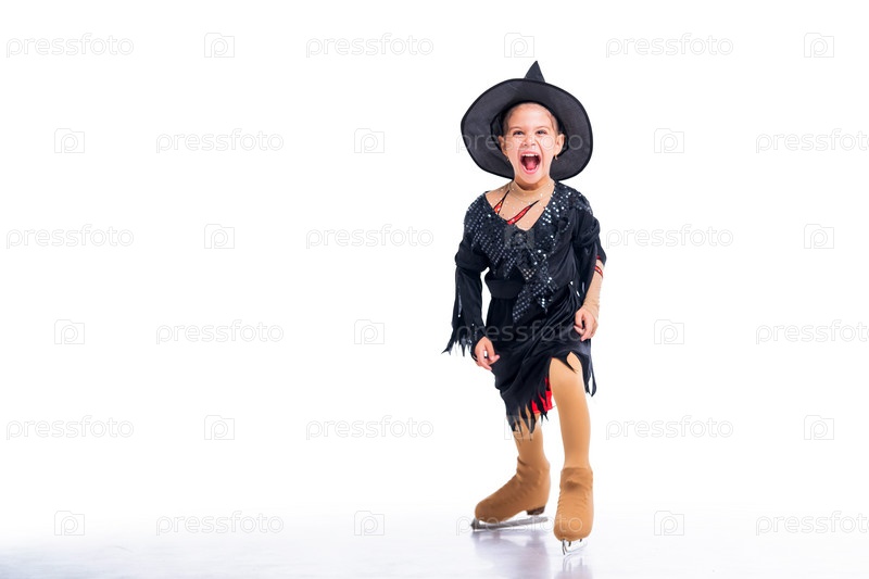 Маленький молодой фигурист позирует в костюме ведьмы на Хэллоуин на ледовой арене на белом фоне