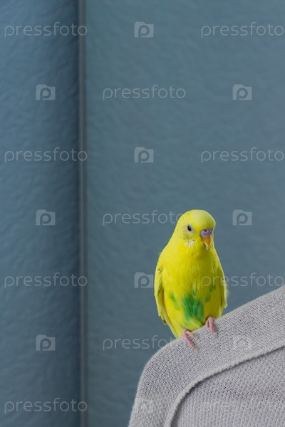 Желтый волнистый попугай или волнистый попугайчик сидит на вешалке на синем фоне