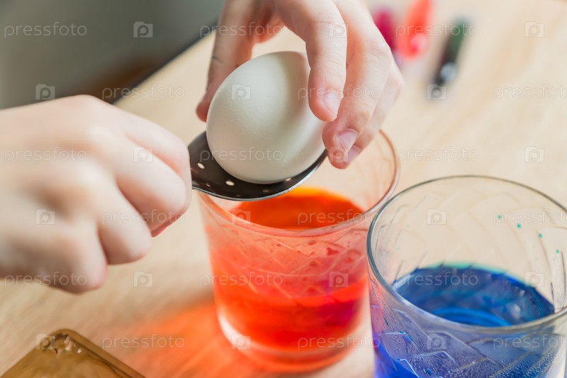 Прозрачные стеклянные чашки с цветной водой. Процесс окрашивания яиц. Руки ребенка положить в белое яйцо с ложкой