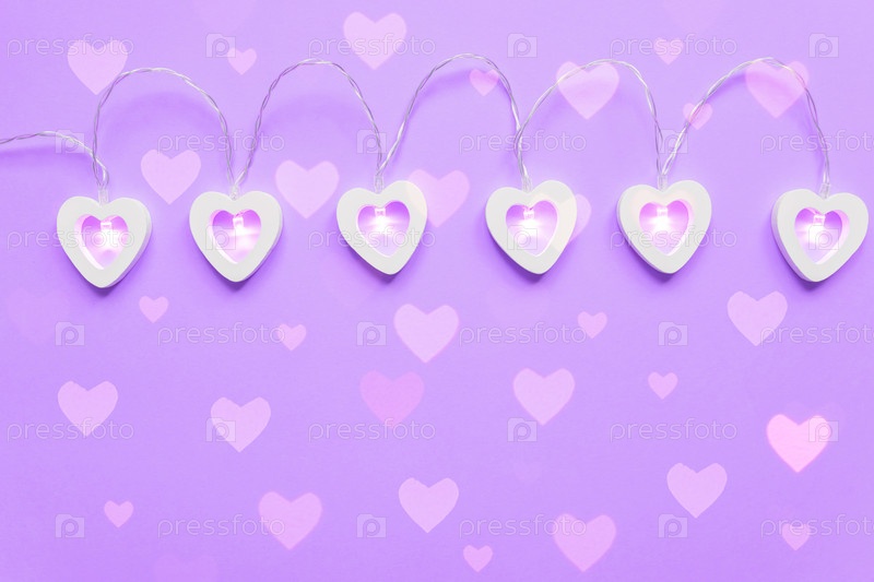 Деревянный харланд в форме сердца на фиолетовом фоне. Открытка на день святого валентина, пространство для копирования
