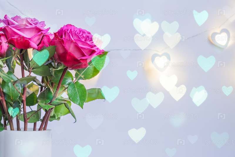 Цветущие розовые розы на гирлянде из электрических сердец. Праздничный фон ко дню святого валентина. Открытка с боке