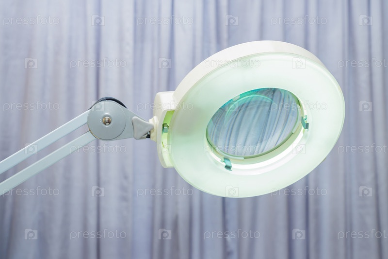 Оборудование салона красоты - лампа с увеличительным стеклом на фоне серых штор. Современные аппараты для проведения профессиональных косметологических процедур
