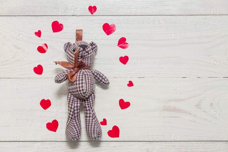 Маленький плюшевый мишка среди красных бумажных сердец на шерстяном фоне. Праздничная открытка на день Святого Валентина