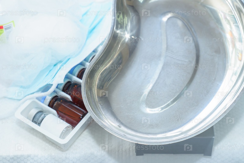 Поднос в форме почки, набор ампул и медицинская маска на столе. Кабинет косметических процедур