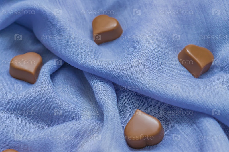 Сердечки из молочного шоколада на синей ткани. Фон праздников Святого Валентина. Концепция любви