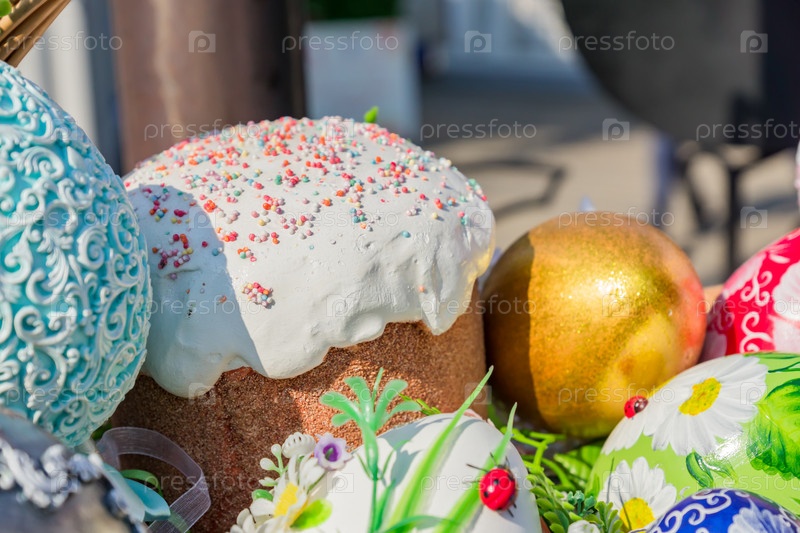 Вестиваль на Пасхальной улице в Москве, Россия. Плетеная корзина с расписными пасхальными яйцами, тортом и цветами