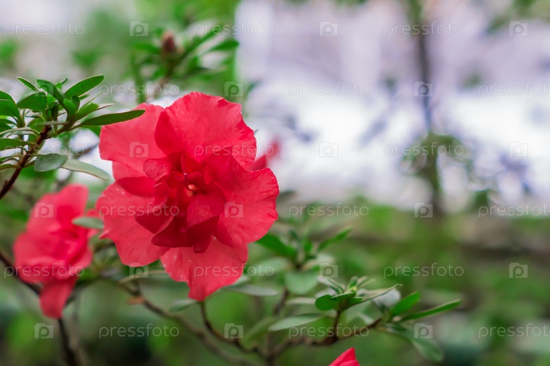 Розовая цветущая азалия в саду. Естественный фон