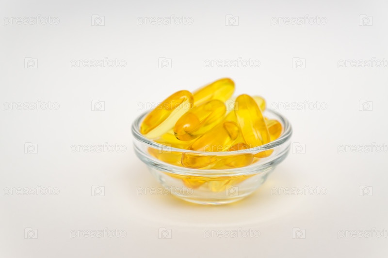 Добавка рыбьего жира, концепция медицины и здоровья, мягкие гелевые капсулы в стеклянной миске на белом фоне