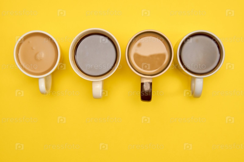 Чашки кофе - черный и с молоком - на желтом фоне. Креативная концепция горячих напитков. Вид сверху, пространство для копирования