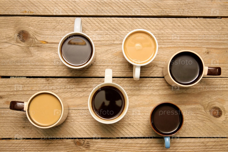 Много чашек с вкусным ароматным кофе на деревянном столе. Вид сверху с копией пространства